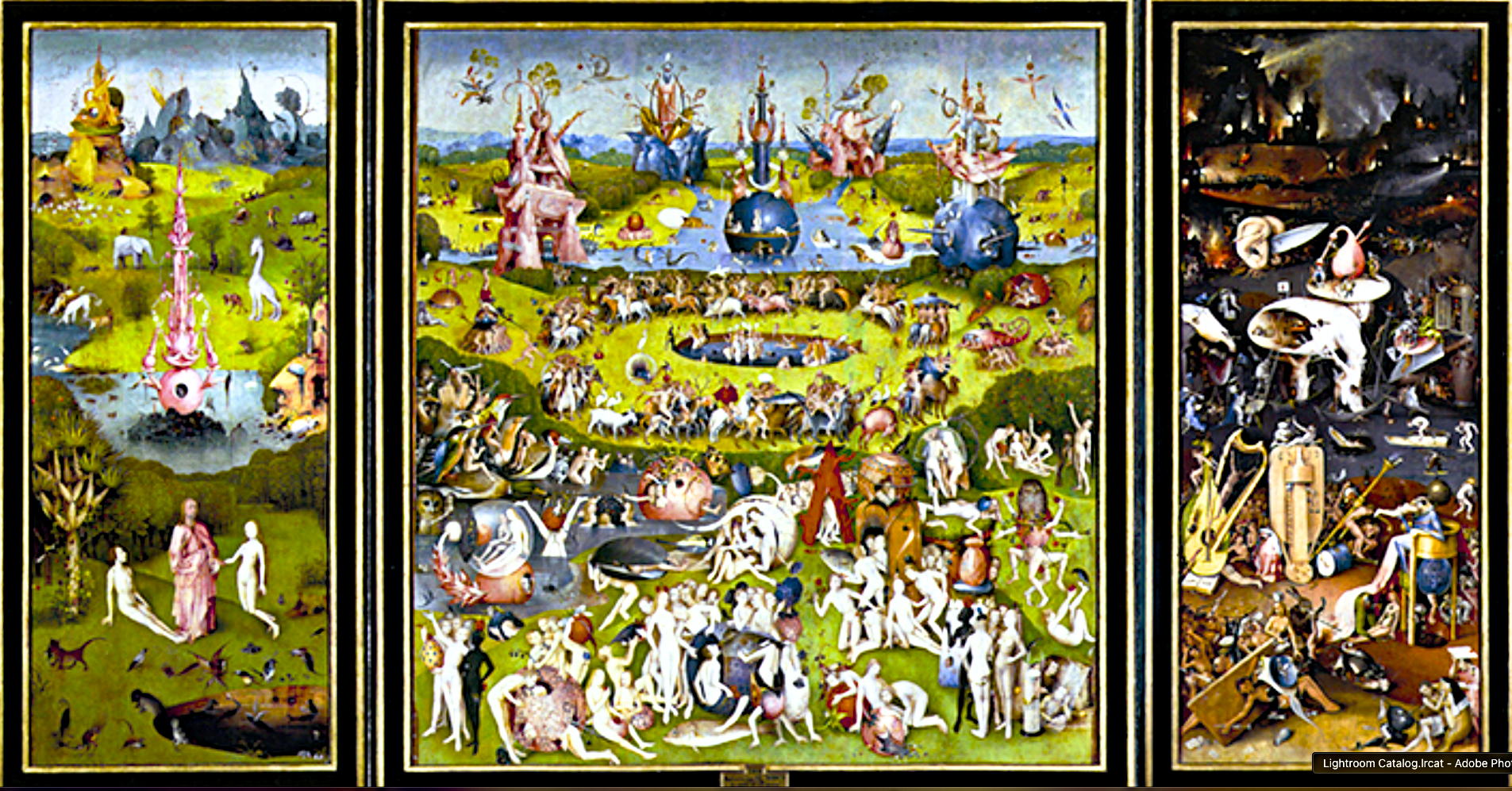 » Auréolée de mystères, Le Jardin des délices est sans doute l’œuvre la plus emblématique de Jérôme Bosch. Peint vers 1500, ce triptyque – format très récurrent aux XVe et XVIe siècles –, serait une commande du comte Henri de Nassau Breda, bien que l’on n’en ait pas la certitude. Les Pays-Bas connaissent alors une période de prospérité économique qui a contribué au succès des Primitifs flamands, dont les œuvres sont souvent riches de symboles. Bosch, issu d’une famille de peintres et d’enlumineurs, était de ceux-là. Marié à une riche aristocrate, membre actif d’une confrérie religieuse composée d’érudits et de théologiens, il ne fait nul doute que ses œuvres étaient de son vivant déjà très convoitées. Mort en 1516 (probablement de la peste), il a emporté avec lui les secrets qui continuent de passionner les historiens ».